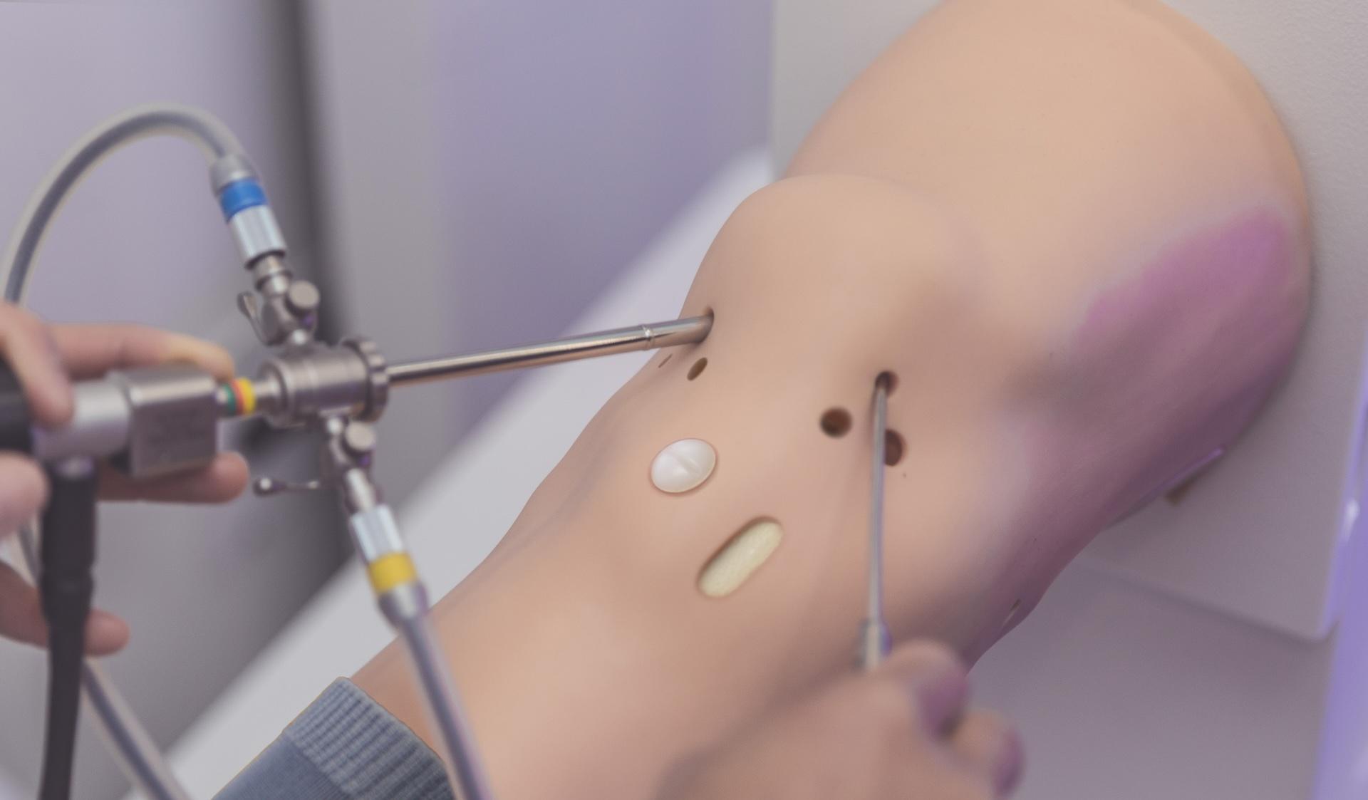 Trainees learn the basics of knee arthroscopy, perform complete diagnostic arthroscopies, and carry out smaller surgical interventions on patient cases with different pathologies. An anatomical knee model with soft skin allows for physical manipulation of the knee joint, including varus and valgus, flexion, extension, hip flexion, hyperflexion, and figure 4.