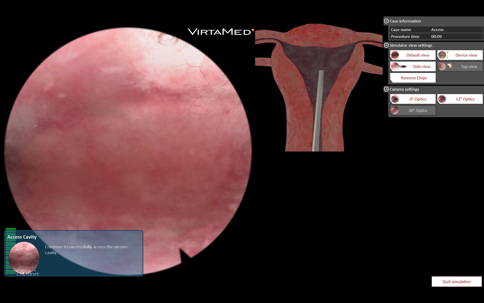 A diversity of training cases teach doctors how to safely insert intrauterine devices (IUDs) in either anteverted or retroverted uteri, and in both nulliparous and parous patients. Repeatable cases help trainees quickly master the relevant motor skills while safely handling and correctly placing the IUDs. A patient comfort scale provides immediate feedback on the safety and quality of the procedure. Outside views and ghost tools guide the trainee during their first placements. Trainees can then record and review unguided procedures for debriefing.