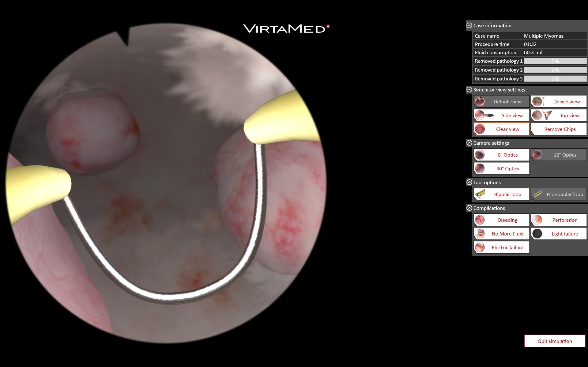 A comprehensive, risk-free endoscopy training simulator that offers students a variety of pathologies and cases at all difficulty levels. Students use original medical instruments to practice treating virtual fibroids, establishing uterine distension, clearing viewing conditions, and safely handling loop electrodes and rollerballs for resection, coagulation, and endometrial ablation. For more experienced learners, there are patients with more serious gynecological pathologies, such as multiple polyps, intramural fibroids, uterine adhesions, or a septum. In the risk-free environment of simulation, students can also train on more advanced endoscopic techniques, such as reducing fluid inflow to reduce uterine distension and allowing intramural fibroids to expand into the cavity for easier resection.